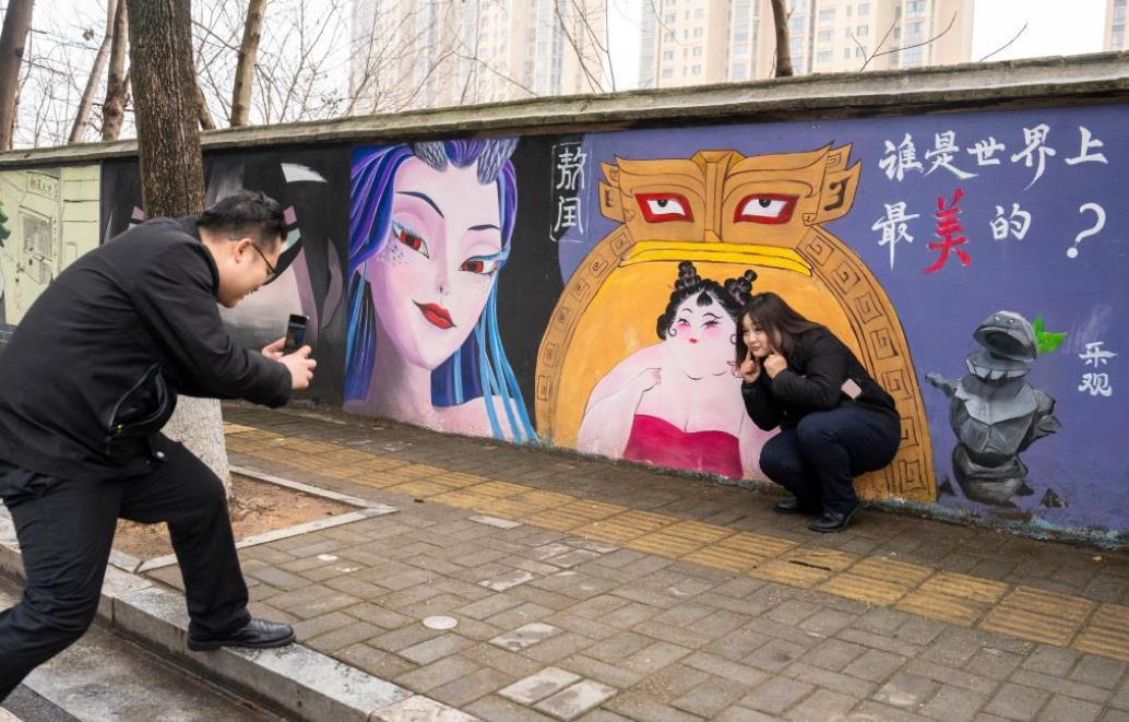 2月23日,在长沙岳麓区岳麓街道五星村,市民与哪吒主题墙绘合影。新华社