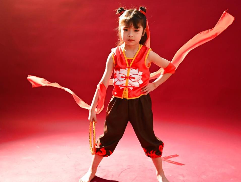 2月22日,小朋友在山东聊城的一家儿童影像馆拍摄哪吒主题写真。新华社
