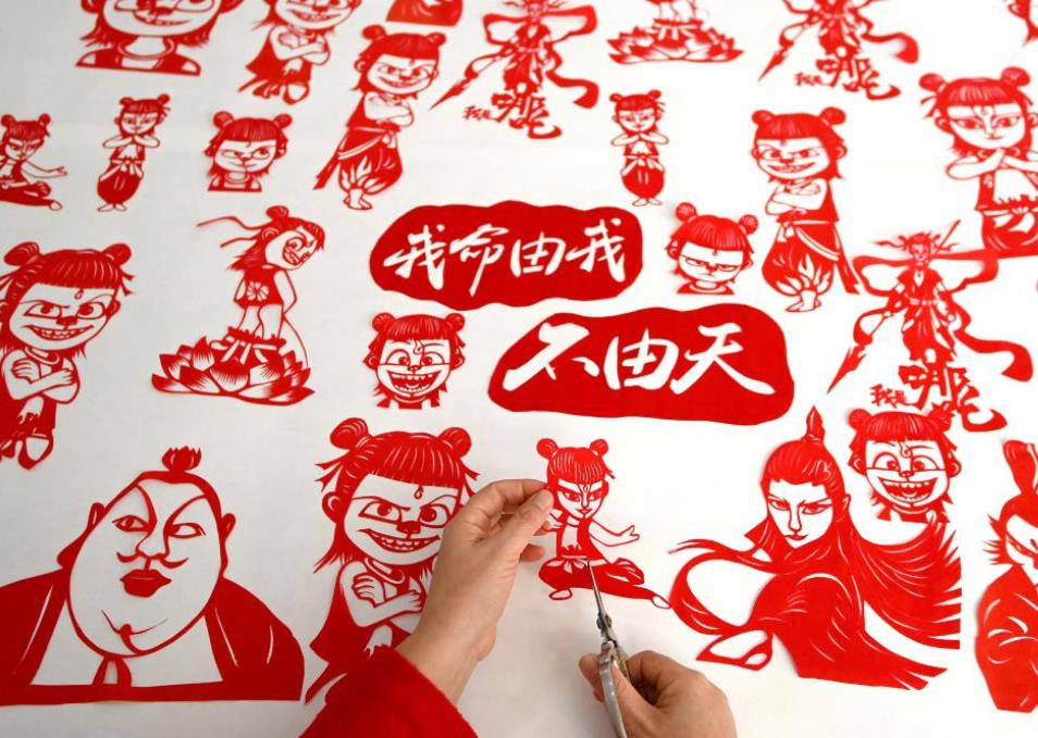 2月13日,河北邯郸一名剪纸艺人在创作哪吒主题剪纸作品。新华社
