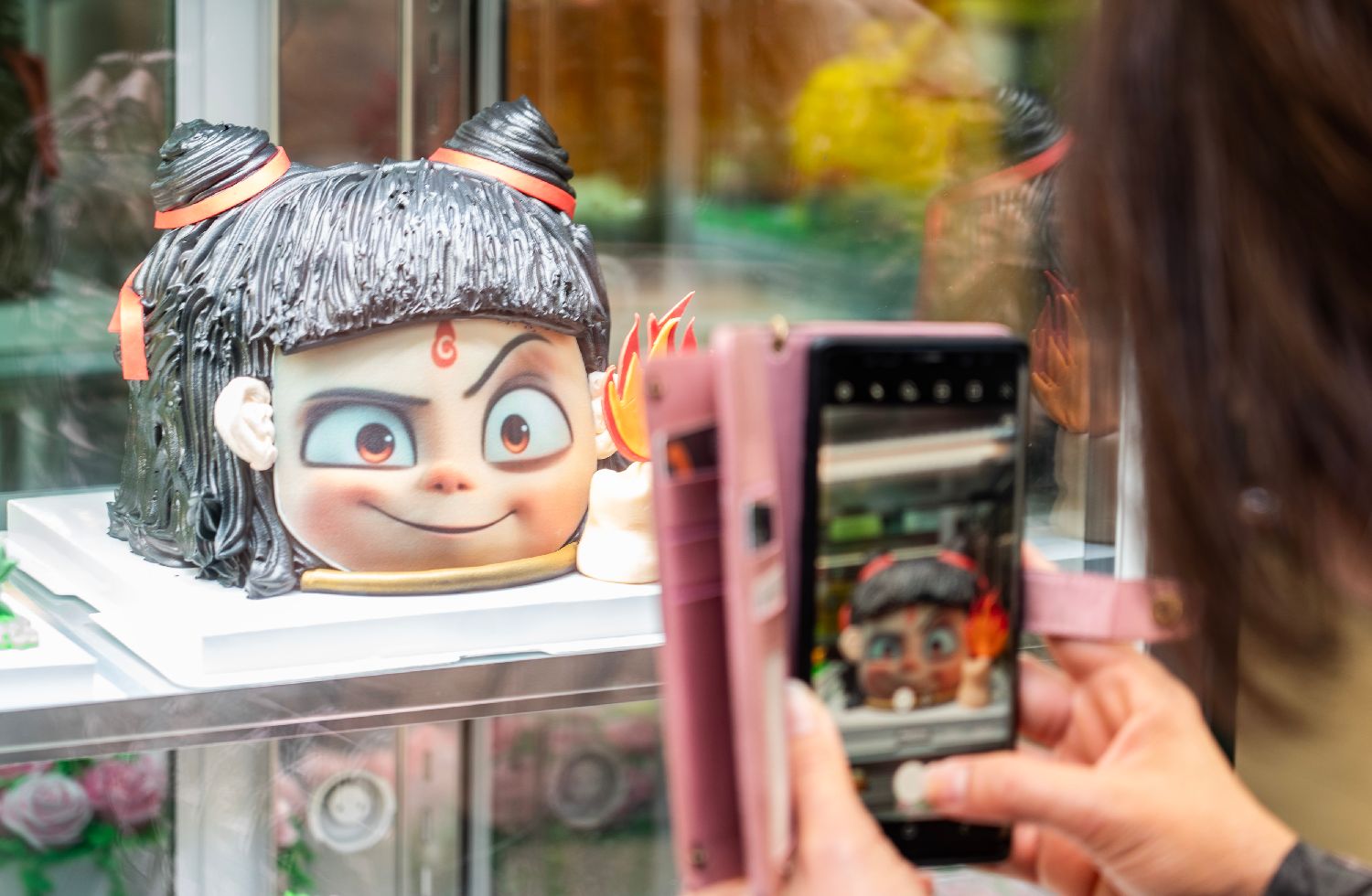 2月22日,香港湾仔一家烘焙店柜台展示的哪吒造型蛋糕吸引市民驻足拍照。中新社