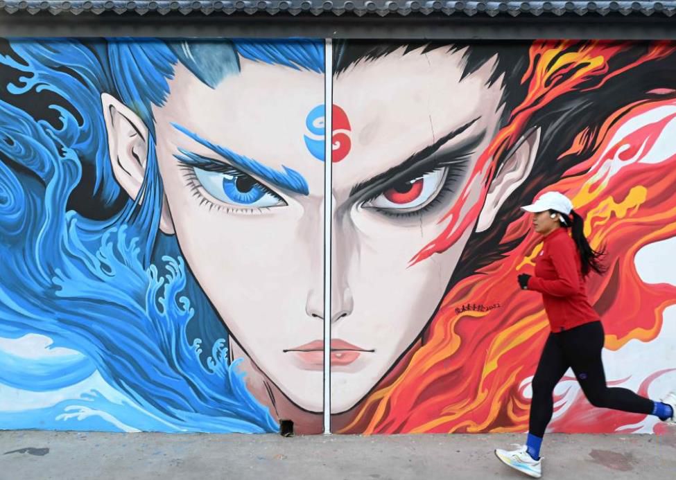 2月15日,市民跑步经过河北石家庄裕华区一处哪吒主题墙绘。新华社