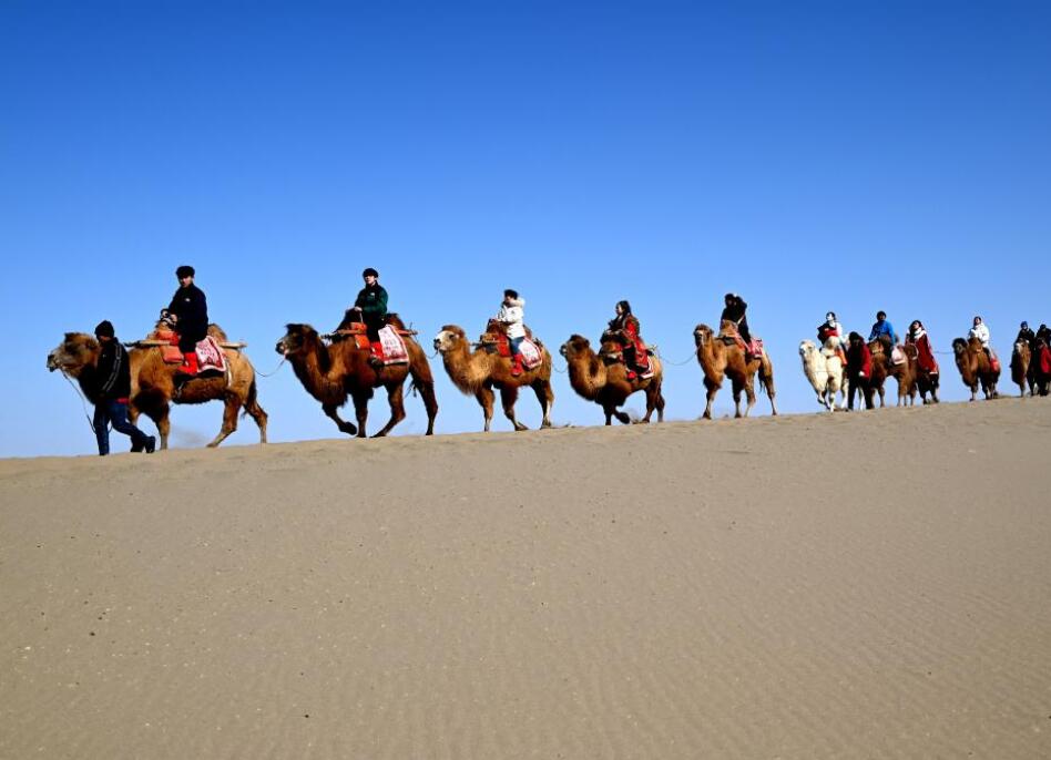 2月23日,游客在甘肃敦煌鸣沙山月牙泉景区游览。新华社