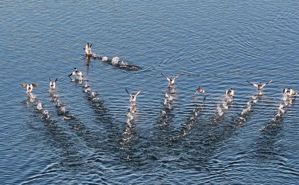 2月24日,河北遵化龙门湖的水鸟在湖面飞翔。新华社