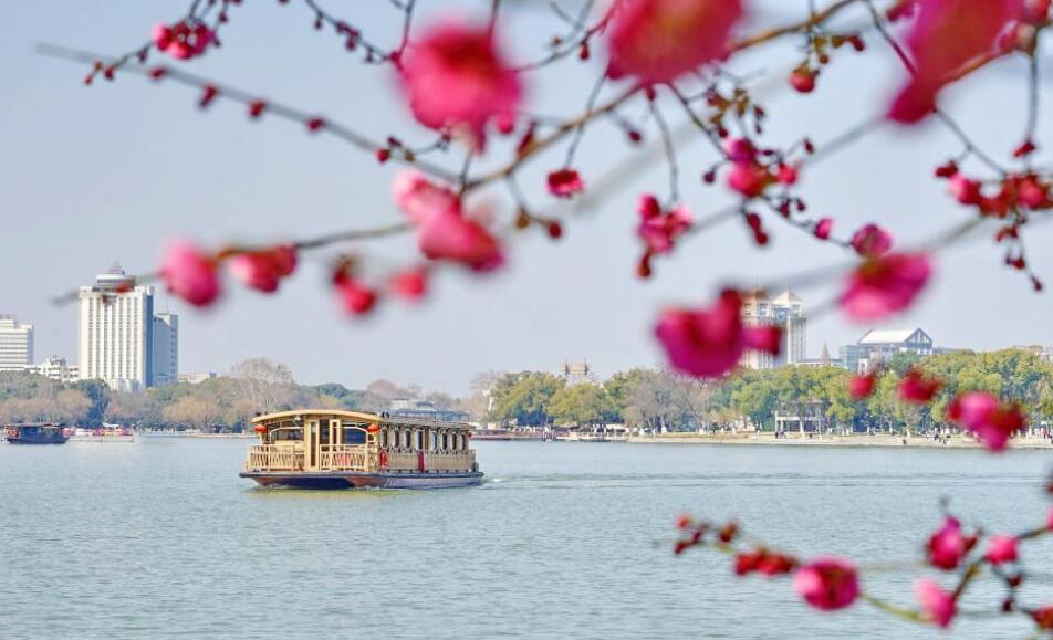 2月24日,一艘船从浙江嘉兴南湖风景区湖面驶过,与绽放的梅花相映成景。新华社