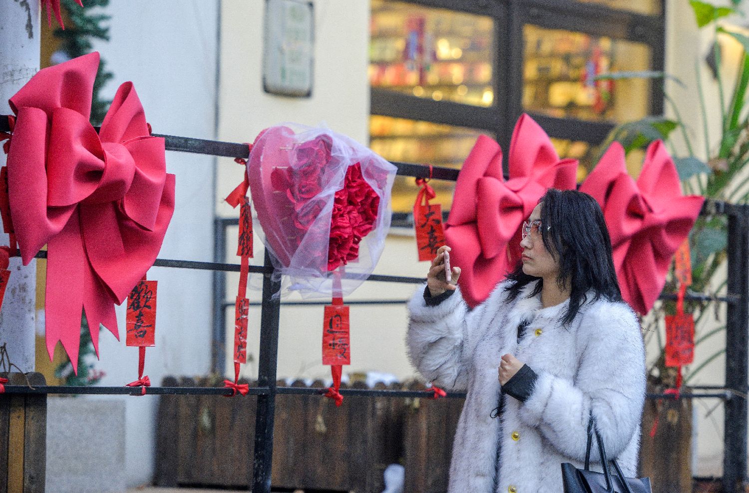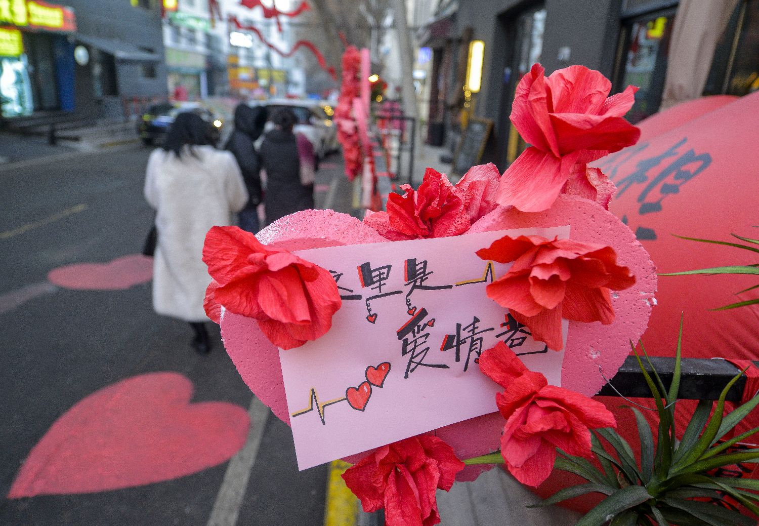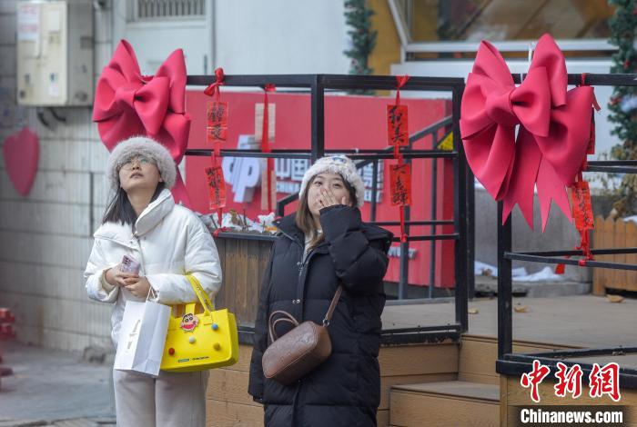 2月24日,“爱情巷”的多样装饰吸引两位女士驻足观看。中新网