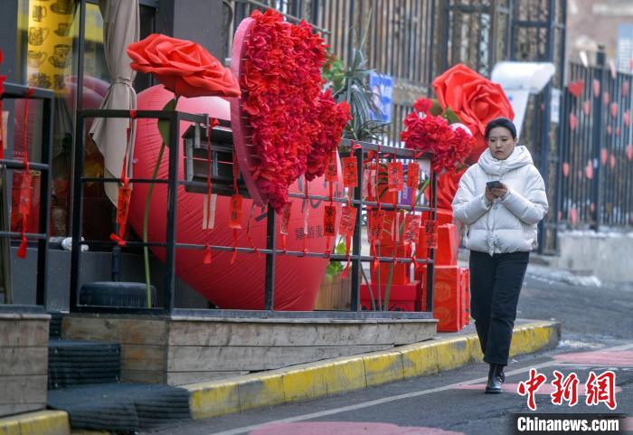 新疆乌鲁木齐南湖东路北六巷是乌鲁木齐市水磨沟区打造的特色街区,以爱情为主题,融入浪漫、温馨等年轻人喜欢的元素,打造文化内涵与休闲功能于一体的街区。图为2月24日,“爱情巷”的手工玫瑰花、爱心、花墙等吸引市民前来打卡。中新社