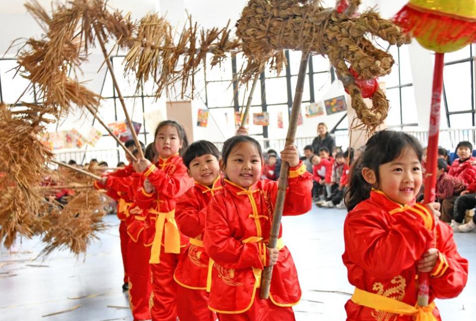 2月27日,浙江台州仙居县下各镇中心幼儿园的孩子在老师指导下进行“稻草龙”表演。新华社
