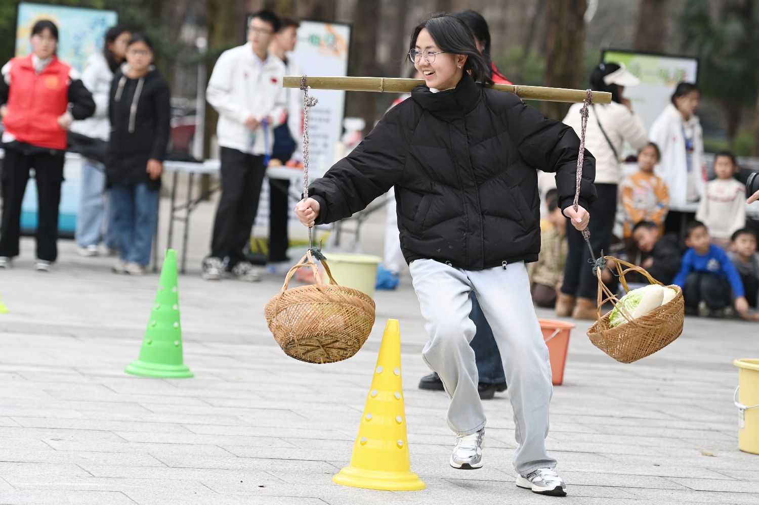 2月27日,位于湖南长沙的湖南农业大学开展“二月二龙抬头”系列农耕活动与舞龙表演,将传统中华农耕文化融入到教育教学中。图为大学生们挑着蔬菜赛跑。中新社