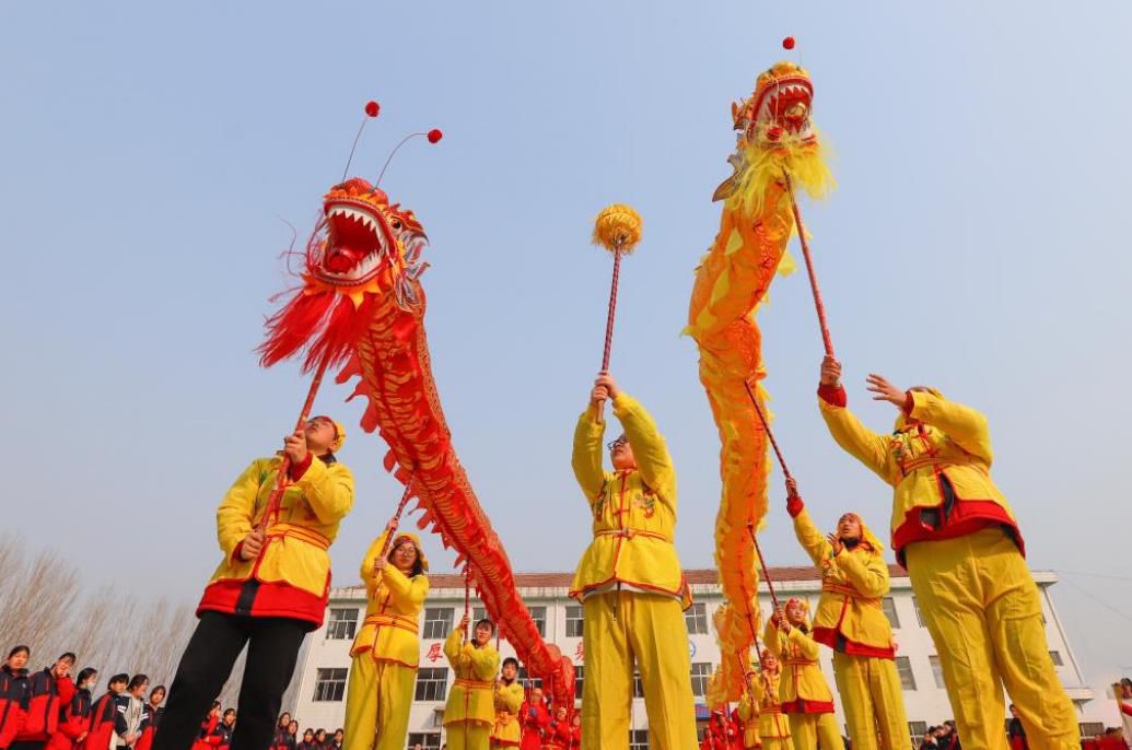 2月27日,河北遵化苏家洼镇下石河中学的学生在进行舞龙表演。新华社