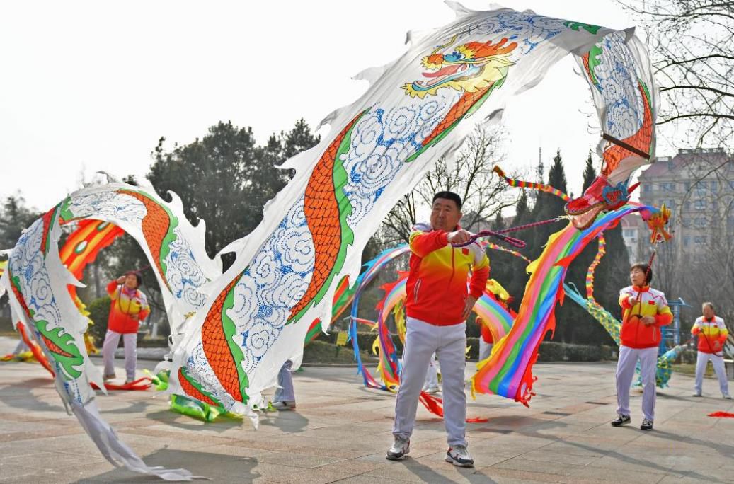2月27日,民间艺人在山东烟台福山区河滨广场表演舞龙。新华社