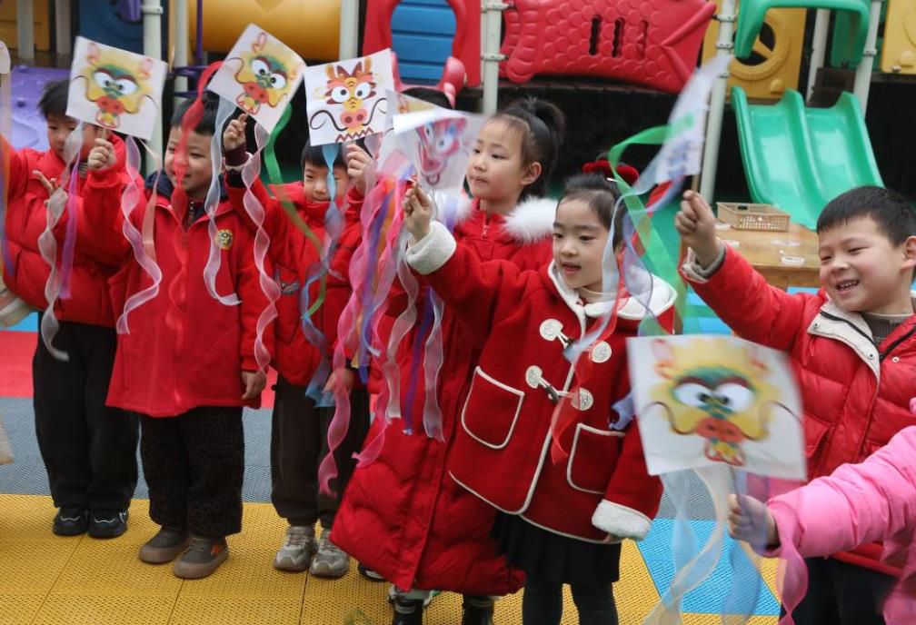 2月27日,江苏宜兴均陶幼儿园的孩子们展示“贴龙须”小手工作品。新华社