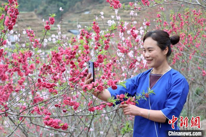 3月3日,村民在广西三江侗族自治县八江镇归令村三合屯桃花林里赏花拍照。中新网