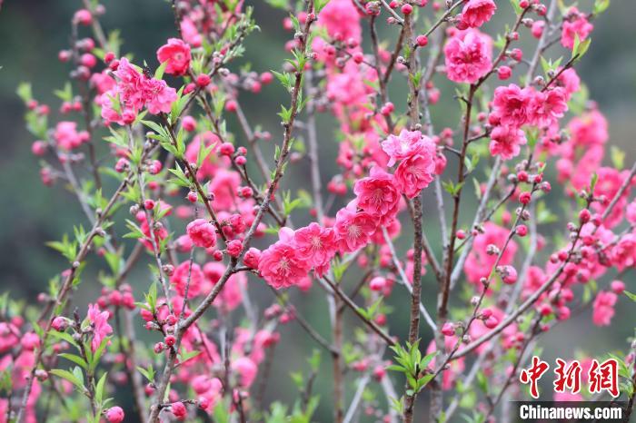 3月3日,村民在广西三江侗族自治县八江镇归令村三合屯桃花林里赏花拍照。图为盛开的桃花。中新网