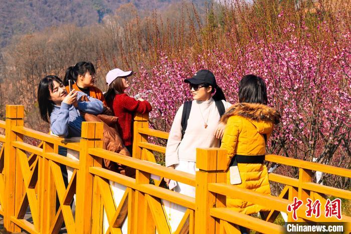 位于秦巴腹地的陕西省安康市宁陕县梅子镇子午梅苑内,百亩梅花竞相开放,满园春色姹紫嫣红,吸引了不少游客前去赏花踏春。图为游客在子午梅苑赏春。中新网