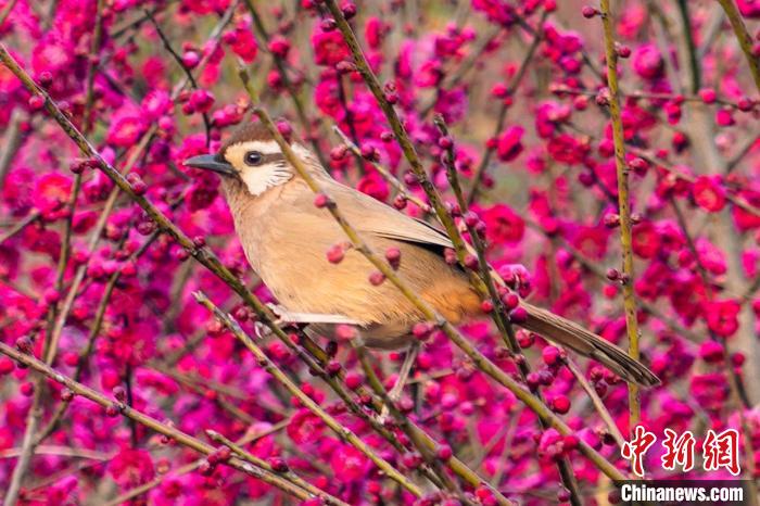 梅子镇子午梅苑内盛放的梅花引小鸟“驻足欣赏”。中新网