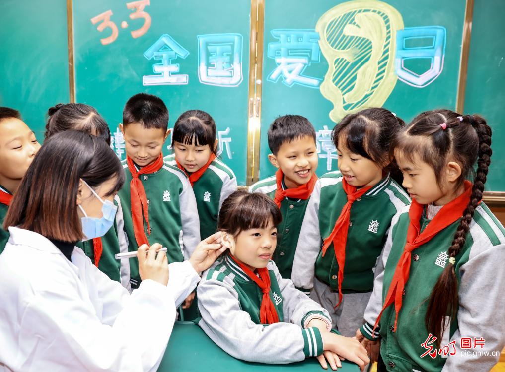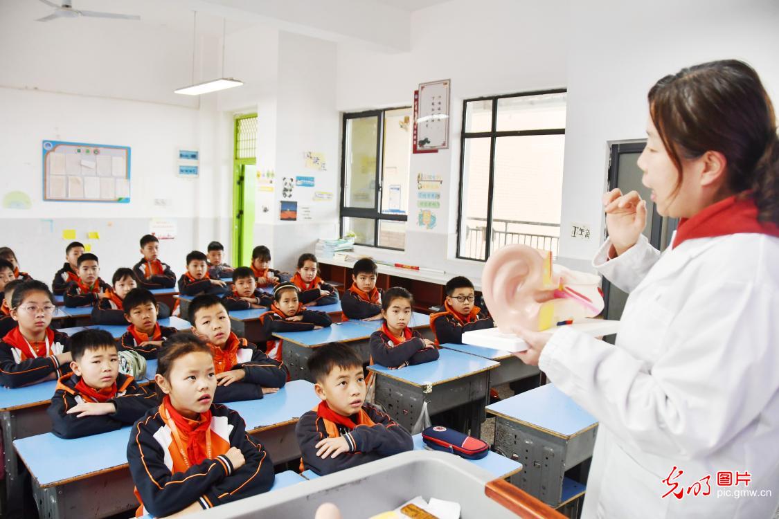 3月3日,湖南省永州市江永县思源实验学校,医务人员为小学生讲解耳朵的结构和功能。北京“光明网”