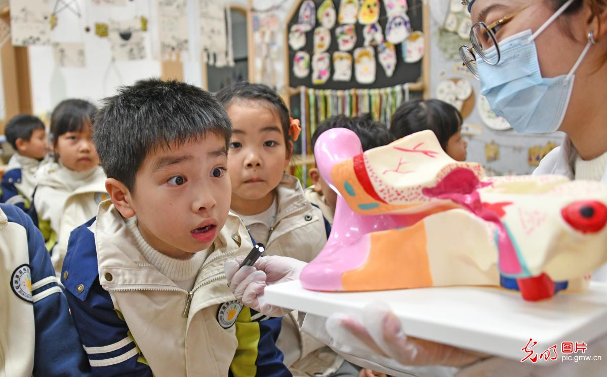 3月3日,浙江省台州市仙居县迎晖幼儿园,医护人员为孩子们讲解耳朵生理构造和预防耳疾等有关常识。北京“光明网”