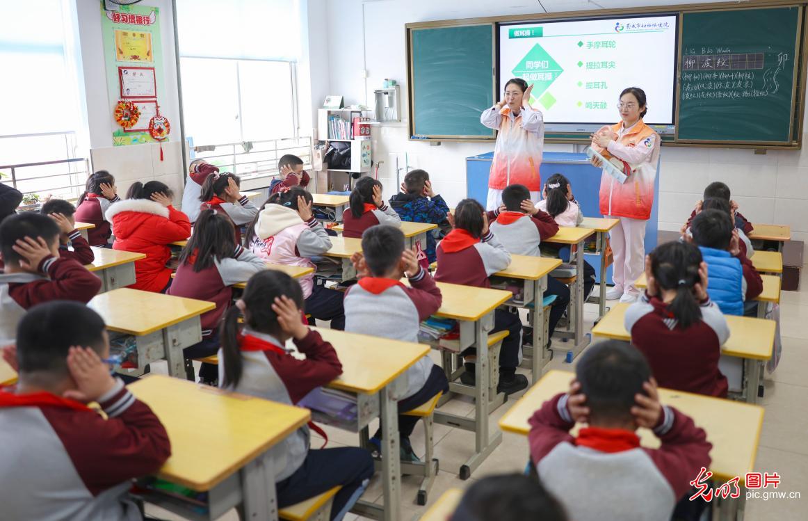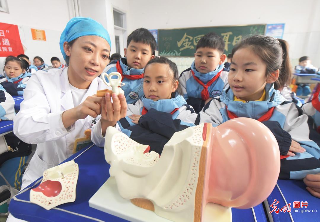3月3日,河北省石家庄新乐市东长寿学校,新乐市医院的医生为学生讲解耳朵生理构造。北京“光明网”