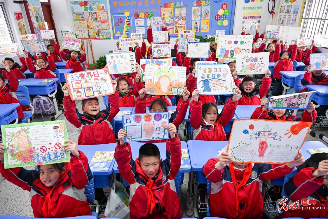 3月3日,江苏省宿迁市泗阳县第二实验小学,学生们展示制作的爱耳日主题画。北京“光明网”