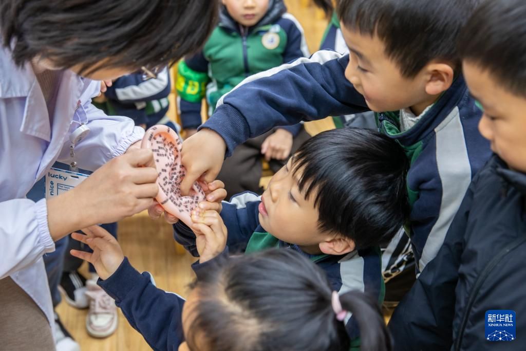 3月3日,医护人员为江苏省南京市雨花台实验幼儿园善水湾分园的小朋友讲解耳朵的穴位和功能。新华社
