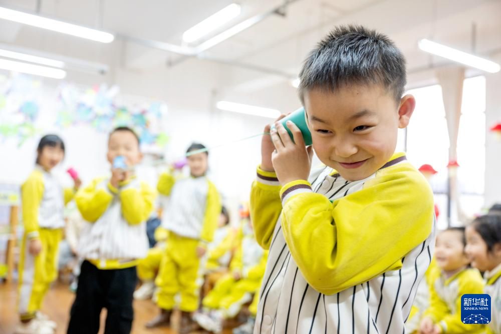 3月3日,浙江省湖州市长兴县龙山幼儿园,孩子们利用自制的传声筒听取声音。新华社