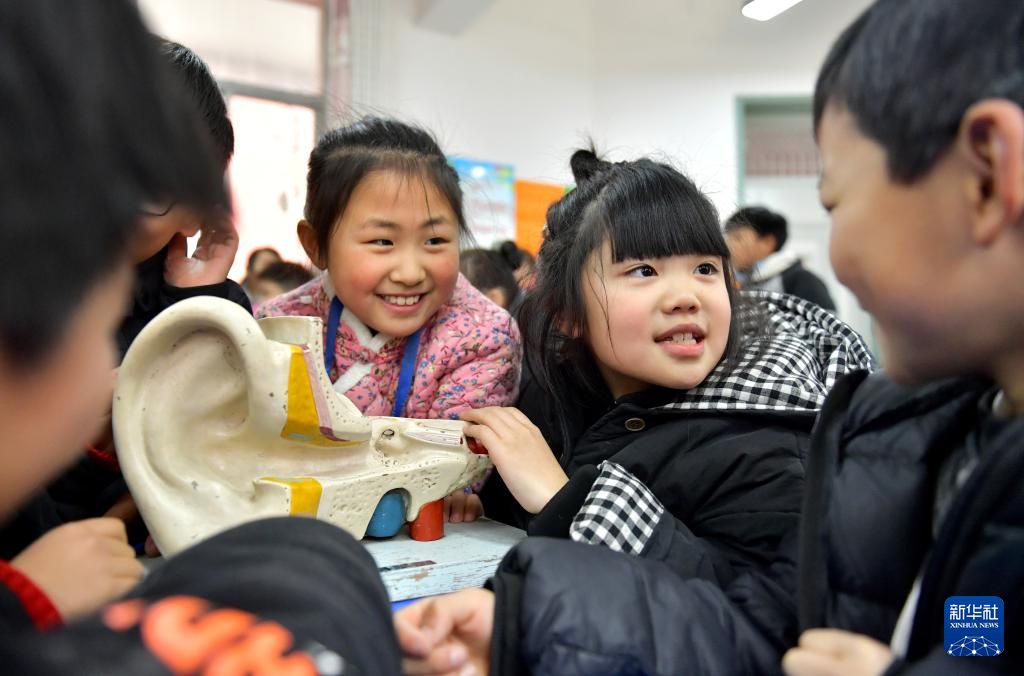 3月3日,在湖北省宜昌市秭归县实验小学,学生们了解耳朵构造。新华社