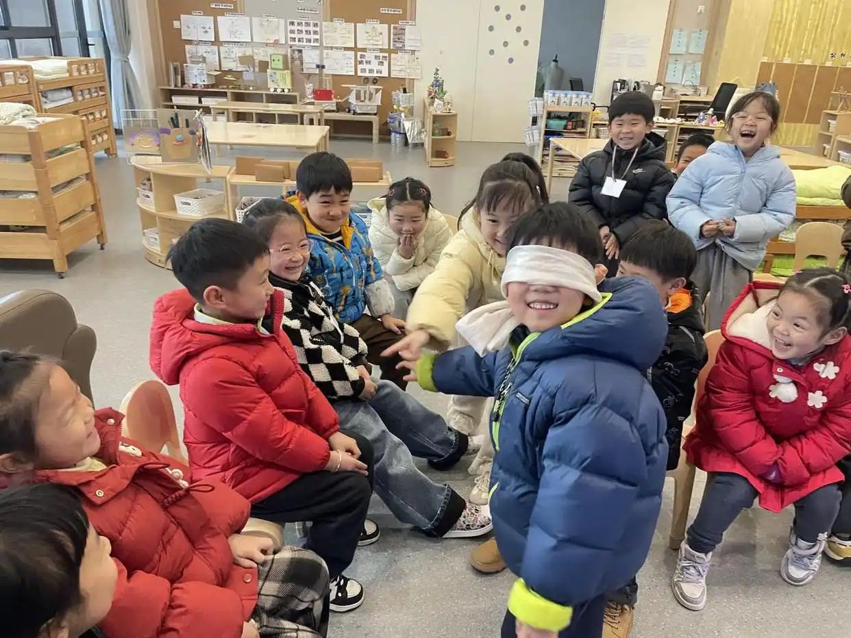 3月3日,在山东省高密市金苹果幼儿园,小朋友在玩“听声辨位”游戏。新华社