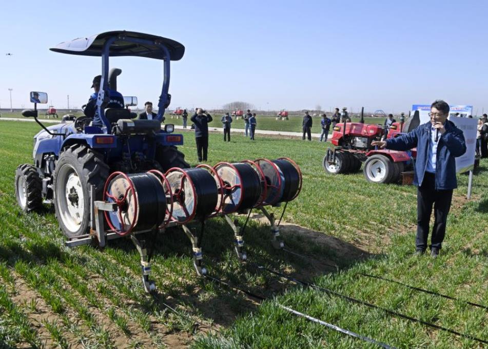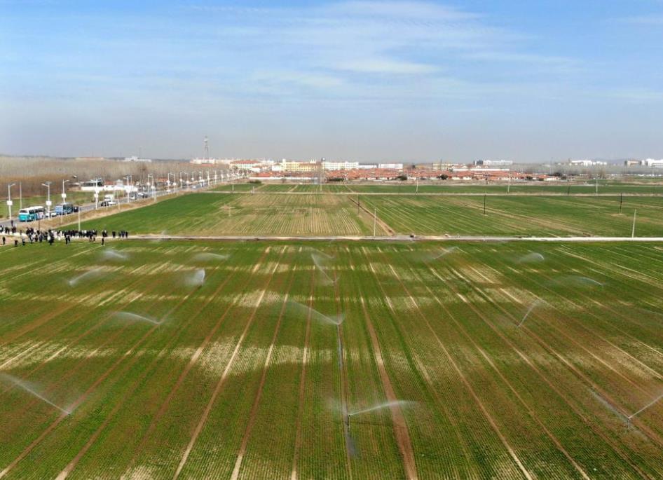春耕时节,智能灌溉设施、无人机、物联网等新技术进入中国田间地头,助力农业增产增收。图为3月13日,在山东青岛西海岸新区大场镇一处农田里,地埋式自动伸缩喷灌设备浇灌小麦。