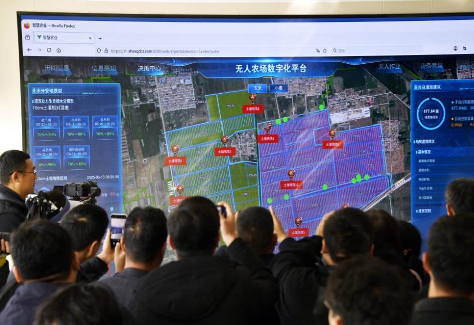 3月13日,在山东青岛西海岸新区绿色增粮先行示范区“无人农场”数字化平台监控室内,农技人员通过大屏幕远程对田间虫情、病情、墒情等信息实时监测。