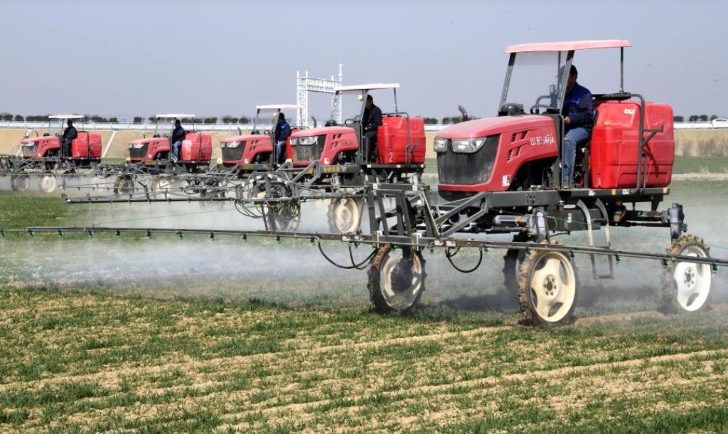 3月13日,在山东青岛西海岸新区绿色增粮先行示范区农田里,自走式喷杆喷雾机进行小麦茎基腐病春季防控作业。