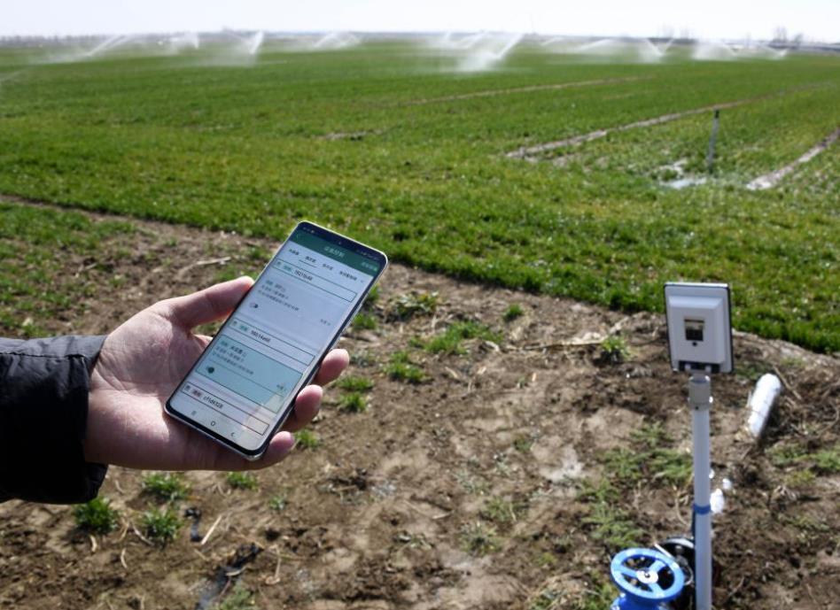 3月13日,在山东青岛西海岸新区大场镇一处农田里,农技人员通过无人农场数字化平台手机端控制农田灌溉。