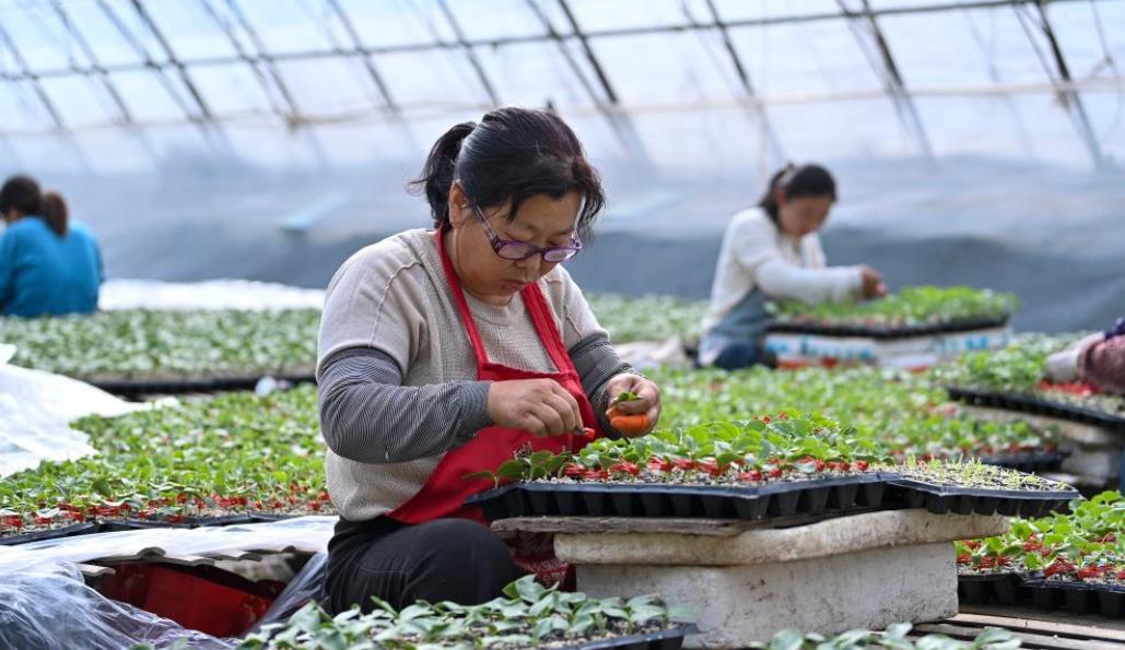 3月13日,在山西运城新绛县泉掌镇王守庄村的山西瑞恒农业股份有限公司蔬菜高新技术示范园内,工作人员在嫁接种苗。