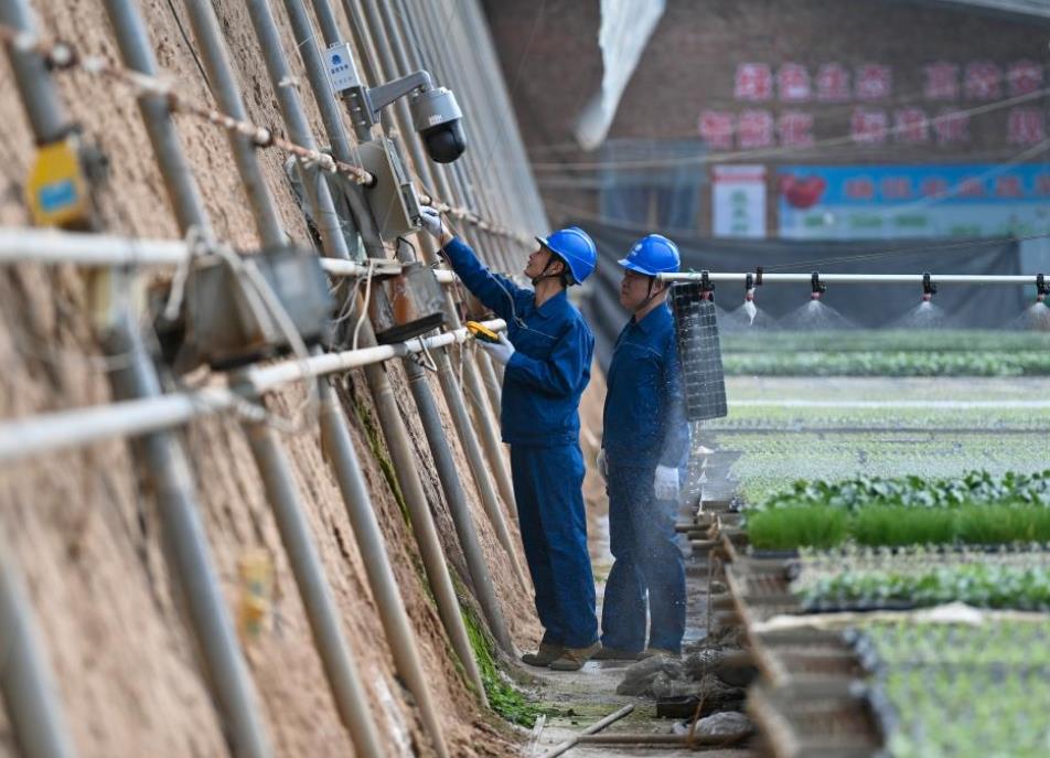 3月13日,在山西运城新绛县泉掌镇王守庄村的山西瑞恒农业股份有限公司蔬菜高新技术示范园内,国网运城供电公司工作人员排查大棚内供电线路的安全隐患。