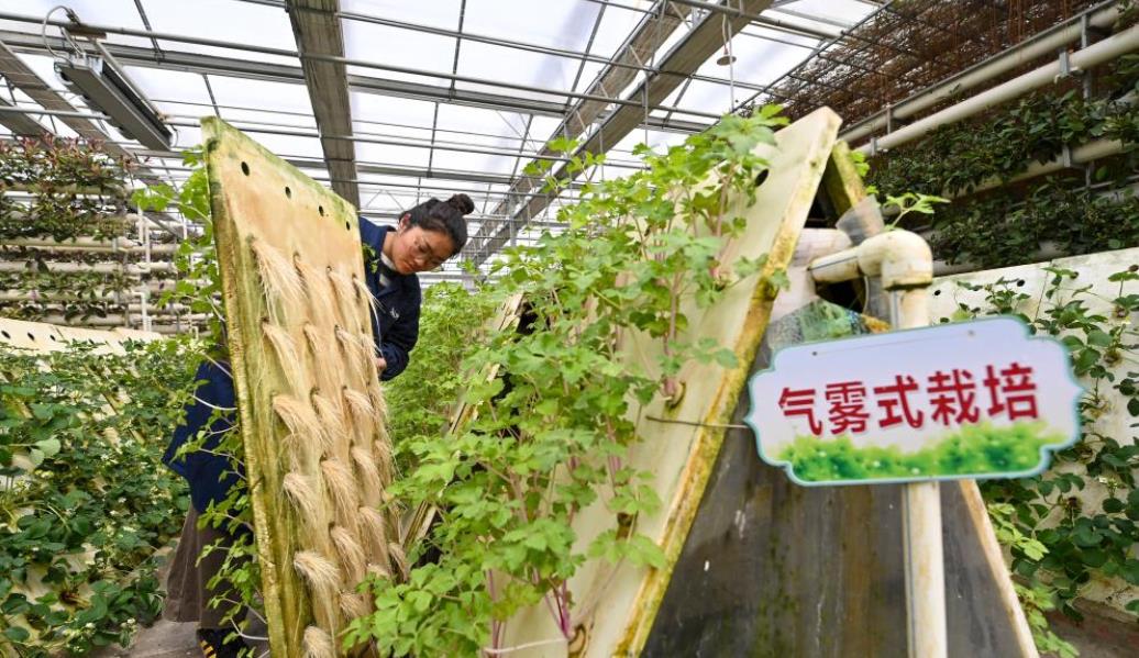 3月13日,在山西运城新绛县泉掌镇王守庄村的山西瑞恒农业股份有限公司蔬菜高新技术示范园内,工作人员查看蔬菜根系生长情况。
