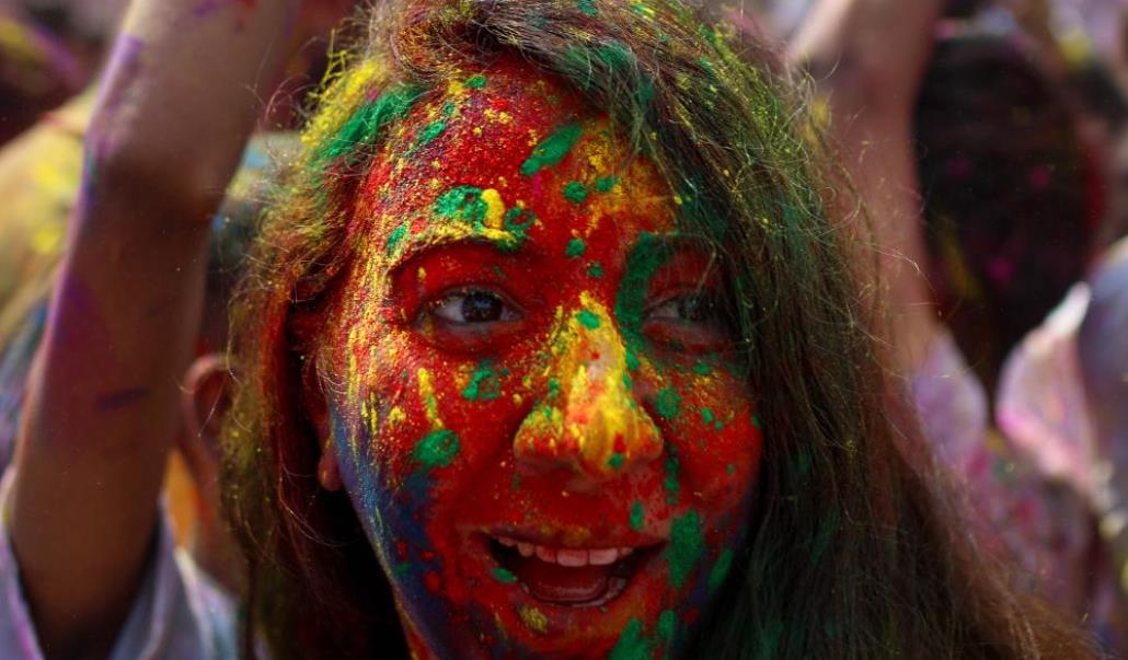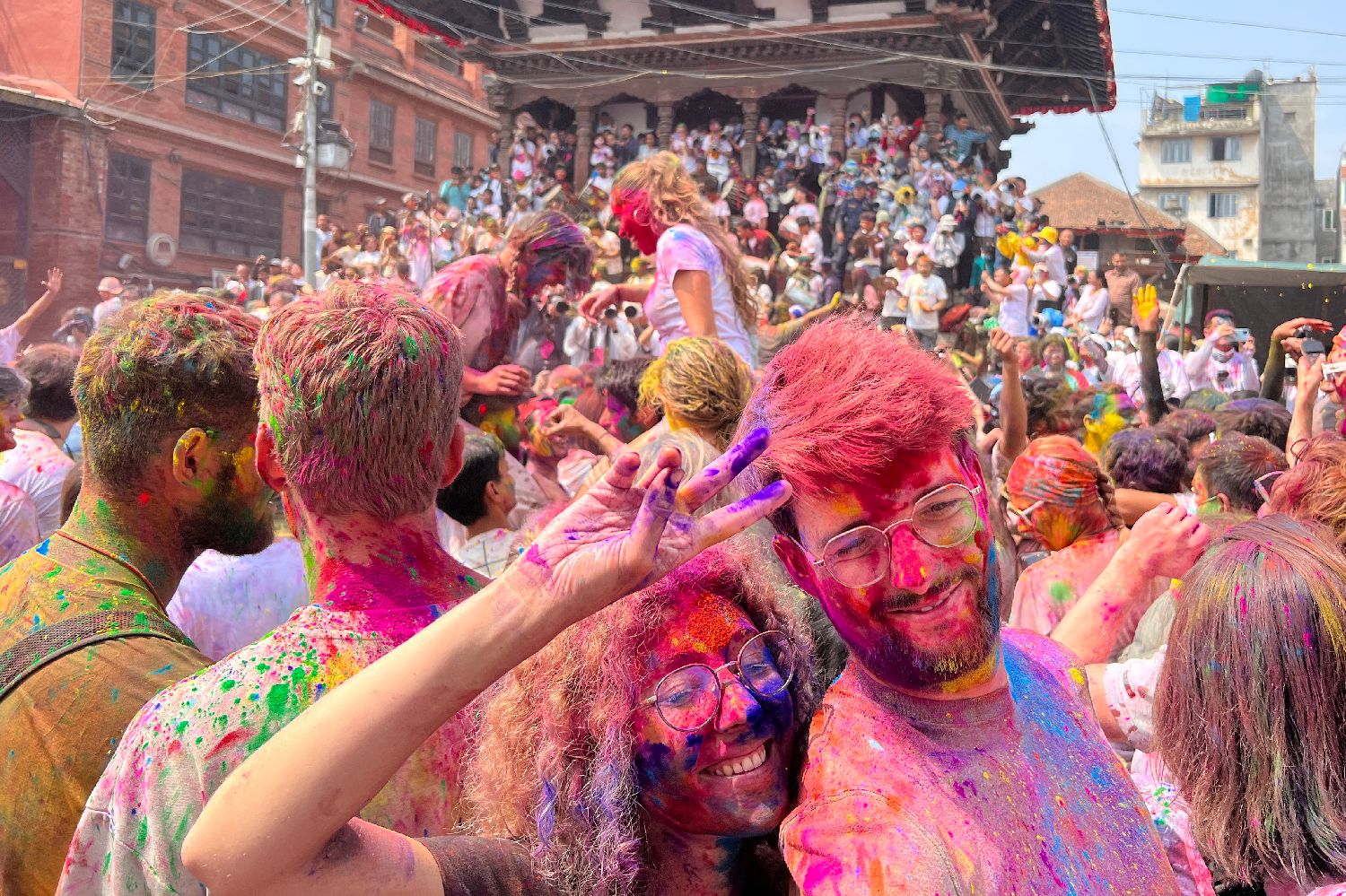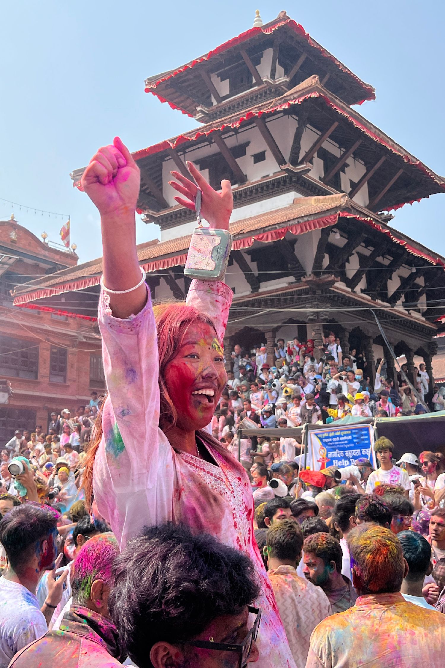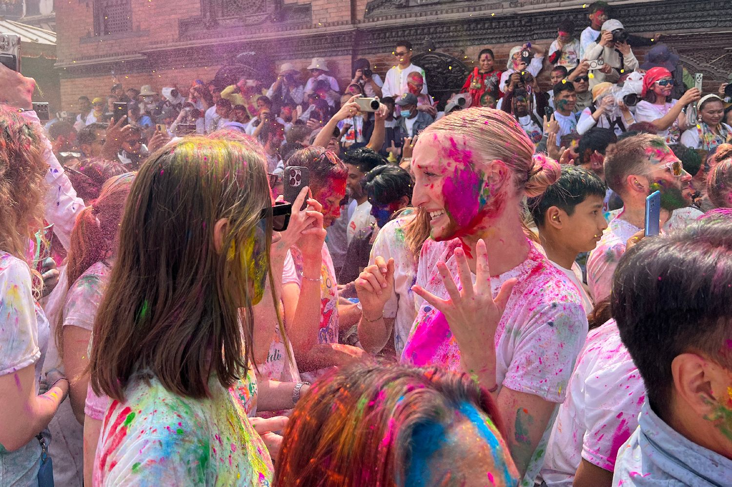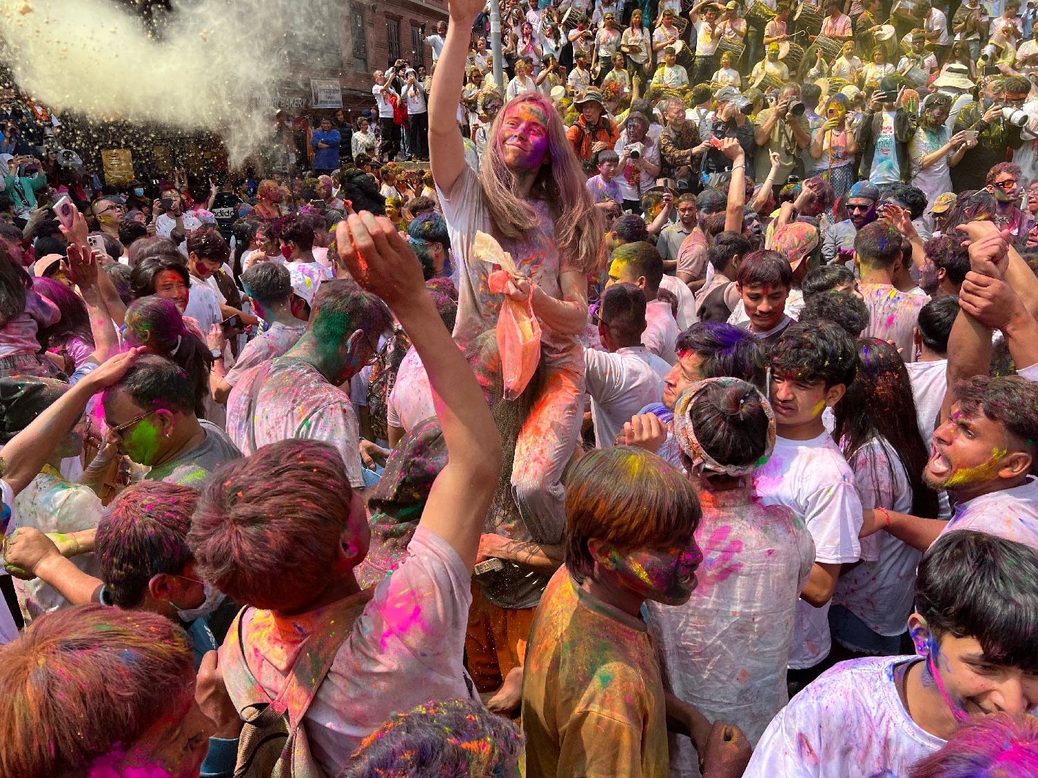 尼泊尔民众与多国游客在加德满都杜巴广场狂欢,共庆洒红节。中新社