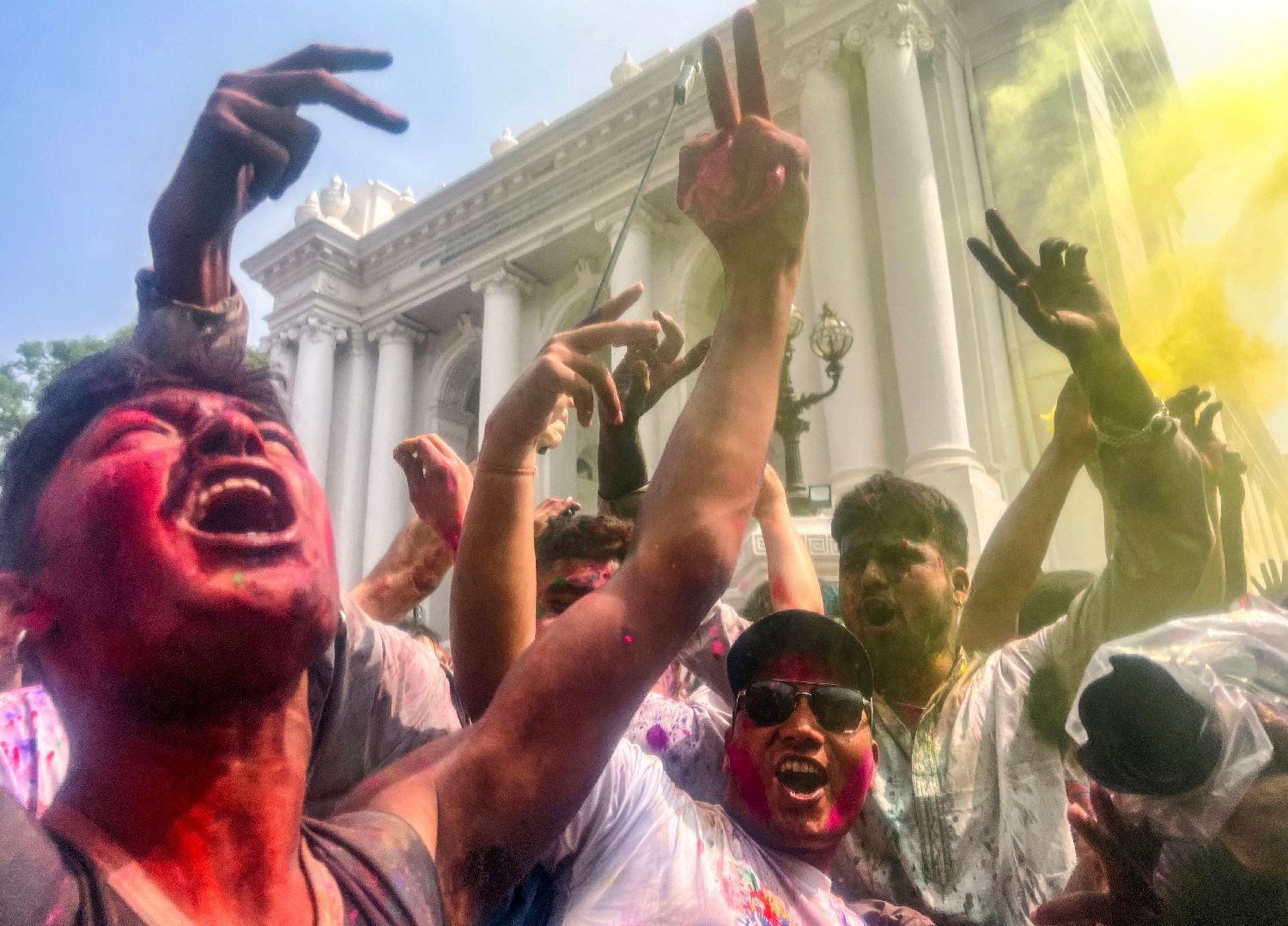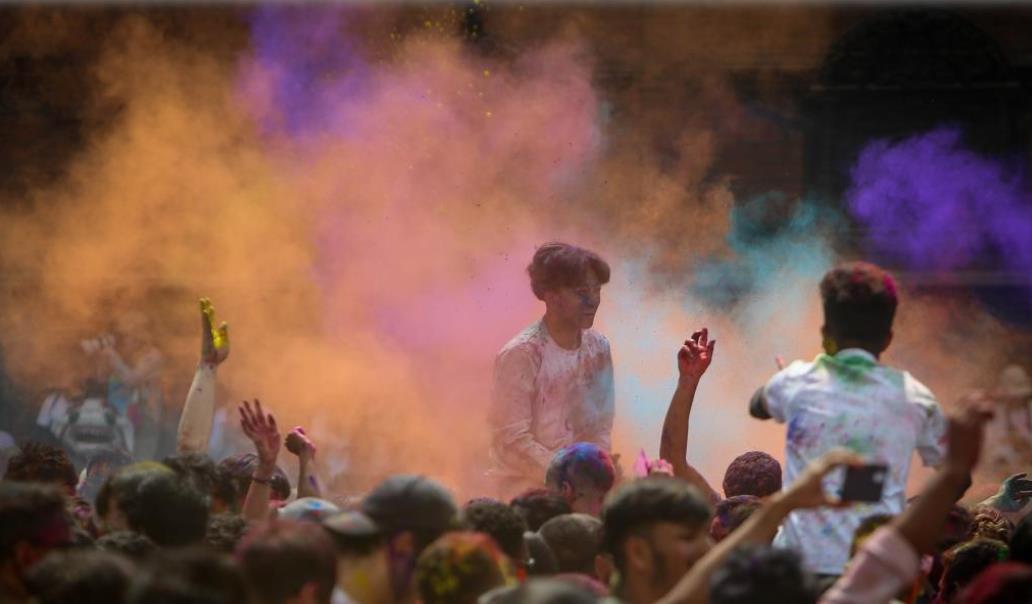 “洒红节”(Holi)又称胡里节,是尼泊尔、印度等地的传统节日,象征春天降临,寓意希望与丰收。今年,加德满都等地在3月13日迎来洒红节,而尼泊尔南部特莱平原则与印度同步,在次日庆祝。图为尼泊尔民众与多国游客在加德满都杜巴广场狂欢,共庆洒红节。中新社