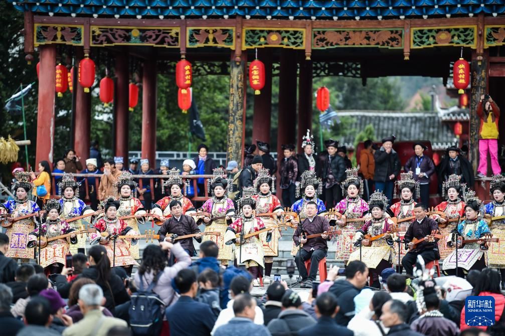 3月15日,在贵州省榕江县三宝侗寨,参加“萨玛节”活动的民众在弹唱侗族琵琶歌。