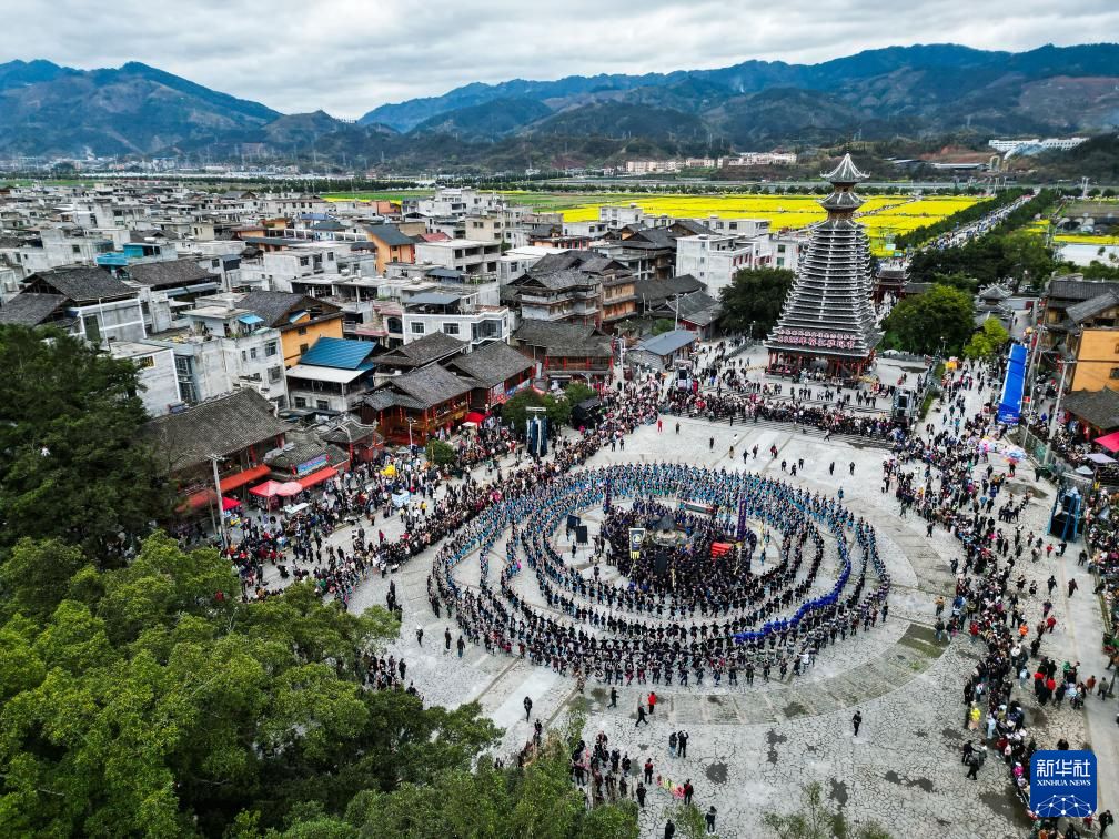 3月15日,当地民众在贵州省榕江县三宝侗寨“萨玛节”活动中跳“多耶舞”(无人机照片)。