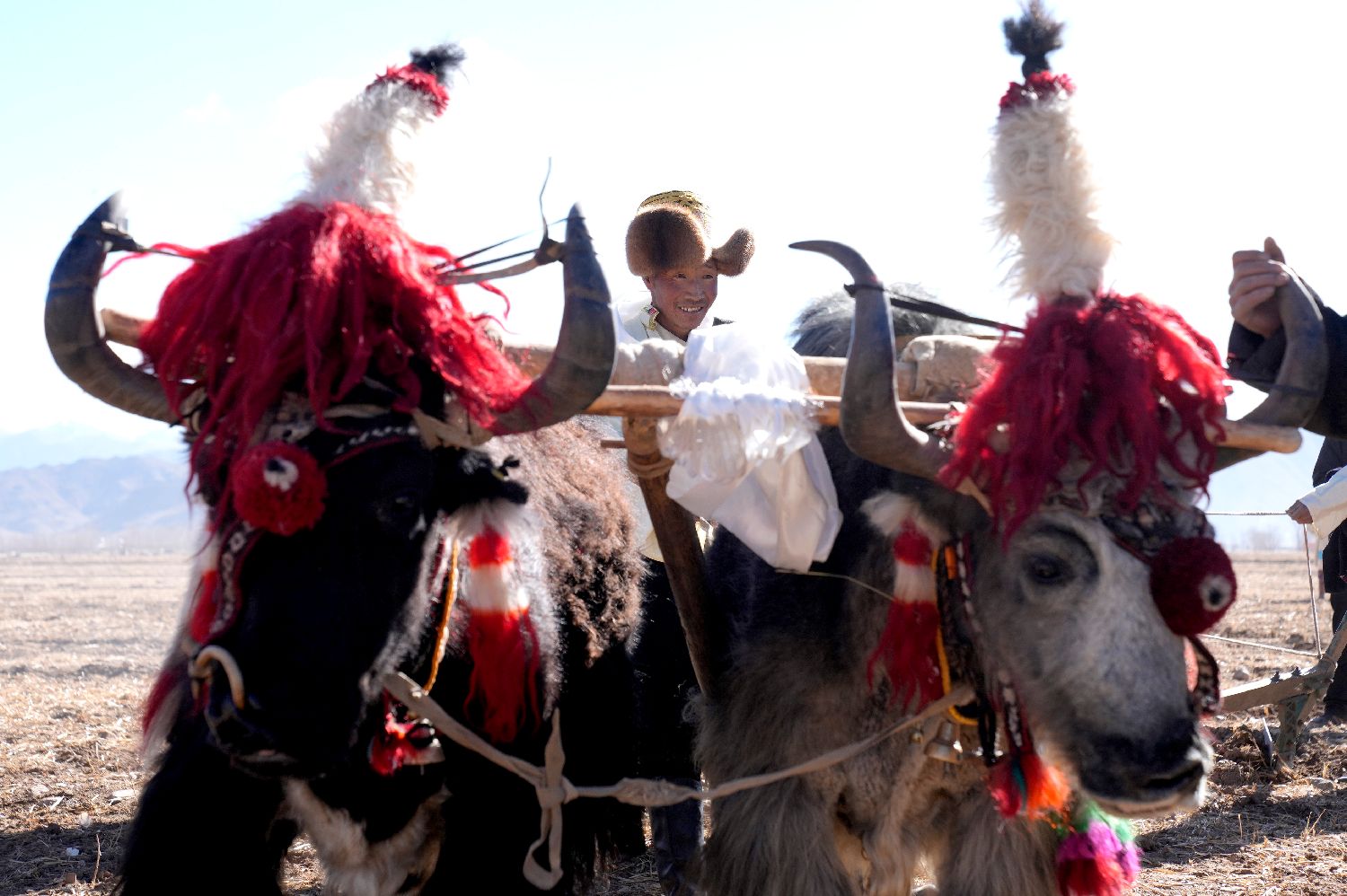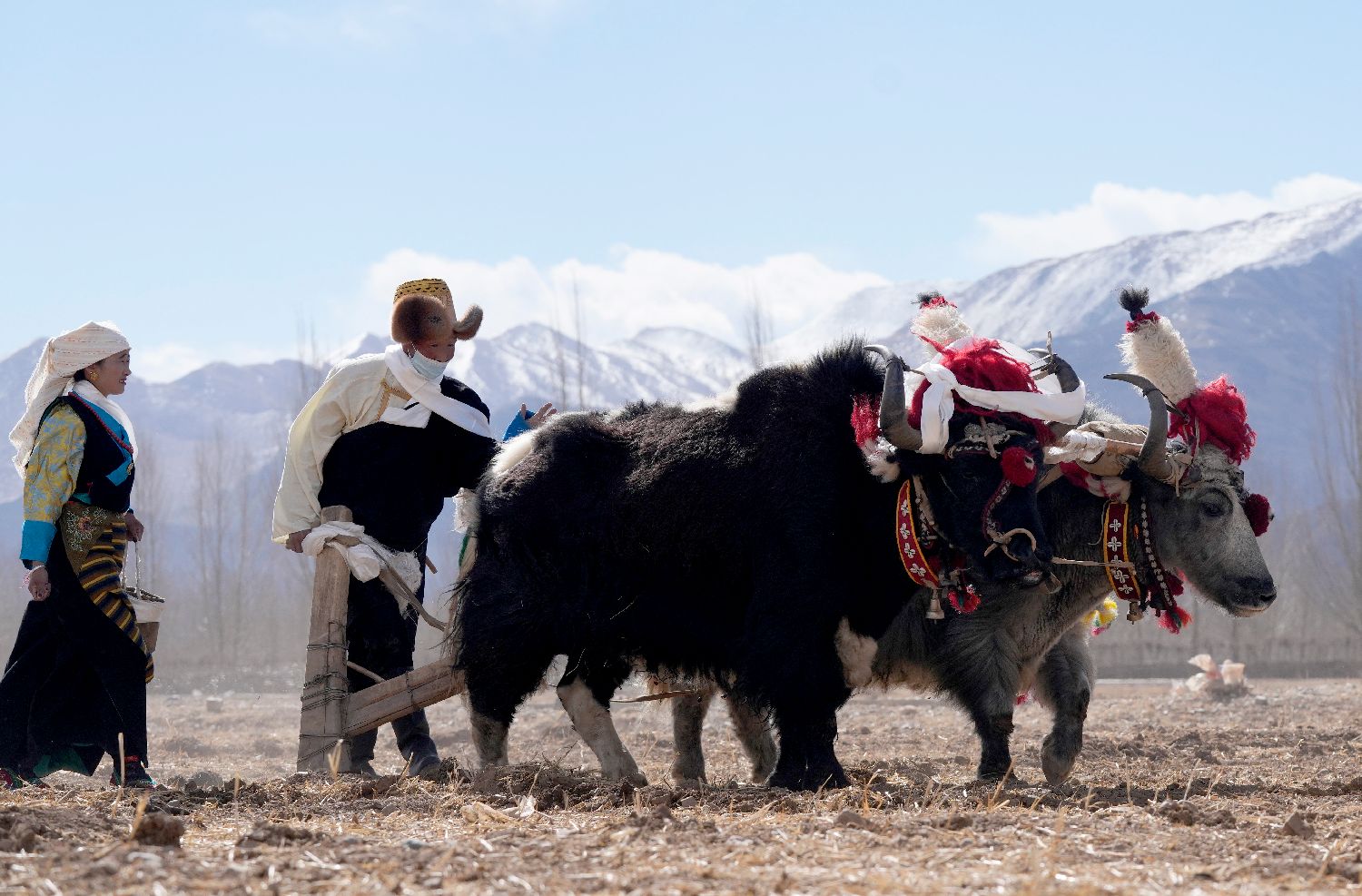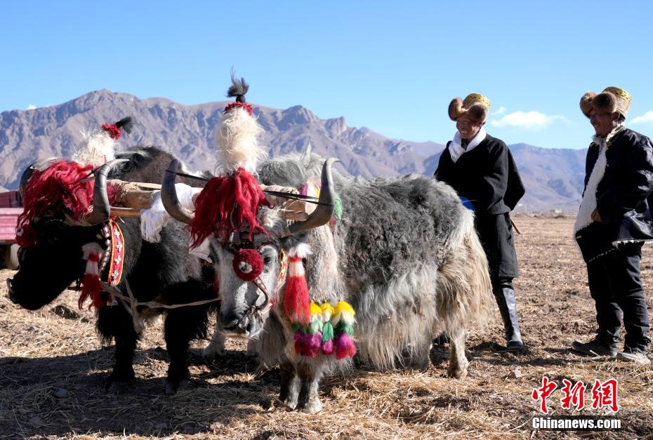 3月16日,拉萨市林周县强嘎乡春耕仪式现场,“二牛抬杠”开启“第一犁”。中新社