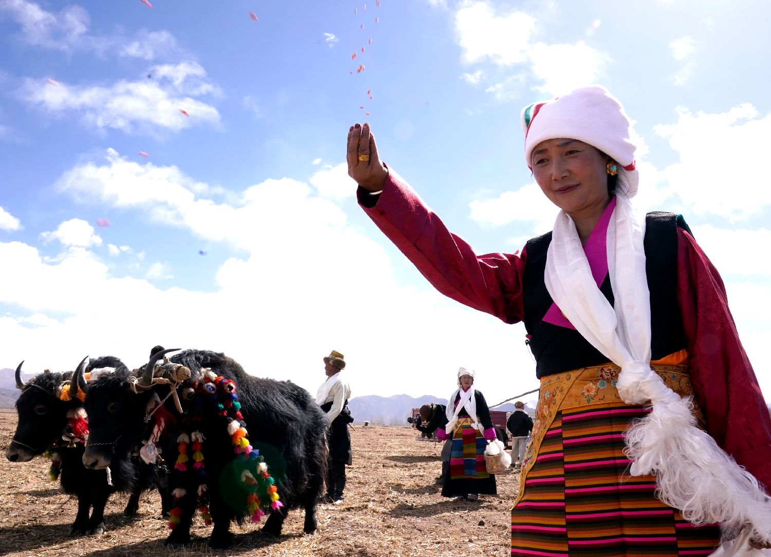 3月16日,拉萨市林周县强嘎乡春耕仪式现场,妇女播撒种子。中新社