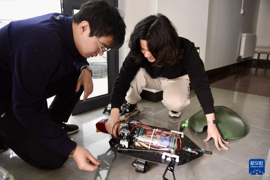 2021年,辽宁省沈阳市东北大学博士生储逸尘在学校三下乡社会实践中关注到仿生机器人可在渔业养殖中发挥巨大作用,于是在东北大学创立仿生智能实验室,带领团队深耕水下仿生机器人领域,不断打磨、迭代产品。 2023年11月,储逸尘创立粼动仿生科技有限公司,公司研发的低驱动仿生机器人矩阵及智能化养殖管理平台已在大连、葫芦岛等地应用,促进当地渔业养殖提质增效。图为2025年3月18日,储逸尘(左)和同事在沈阳粼动仿生科技有限公司内组装两栖仿生海龟机器人。