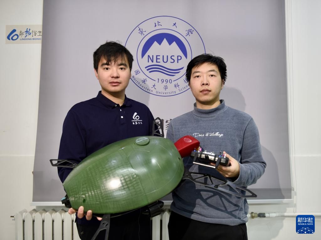 3月18日,储逸尘(左)和同事在沈阳粼动仿生科技有限公司内展示两栖仿生海龟机器人。
