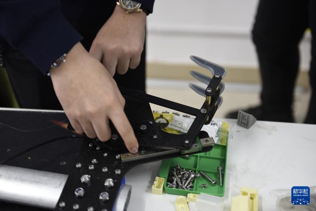 3月18日,储逸尘在沈阳粼动仿生科技有限公司内组装水下仿生机器人机械爪。