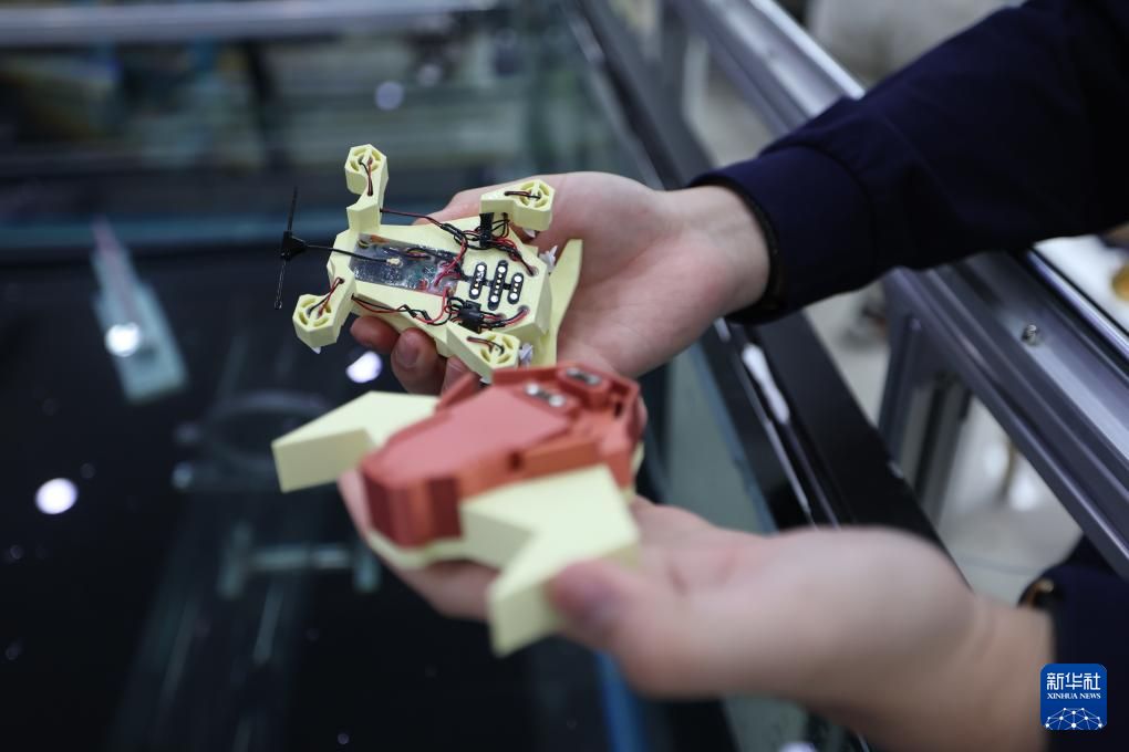 3月18日,储逸尘在沈阳粼动仿生科技有限公司内展示水下仿生机器人。