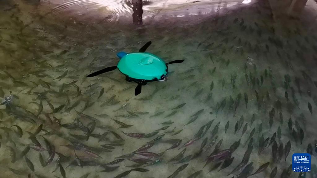 在大连一家渔业养殖场内拍摄的两栖仿生海龟机器人(2024年5月3日摄)。