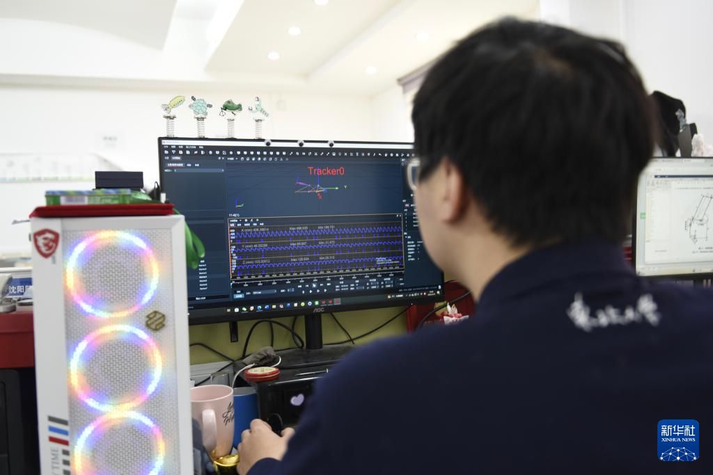 3月18日,储逸尘在沈阳粼动仿生科技有限公司内监测水下仿生机器人运动轨迹。