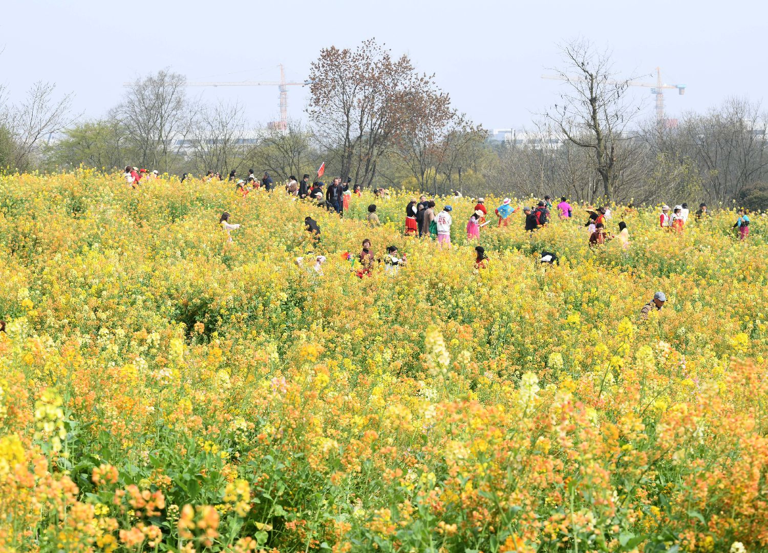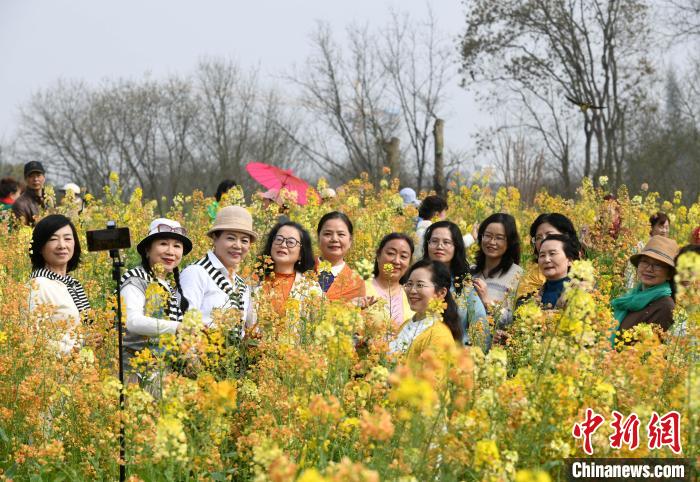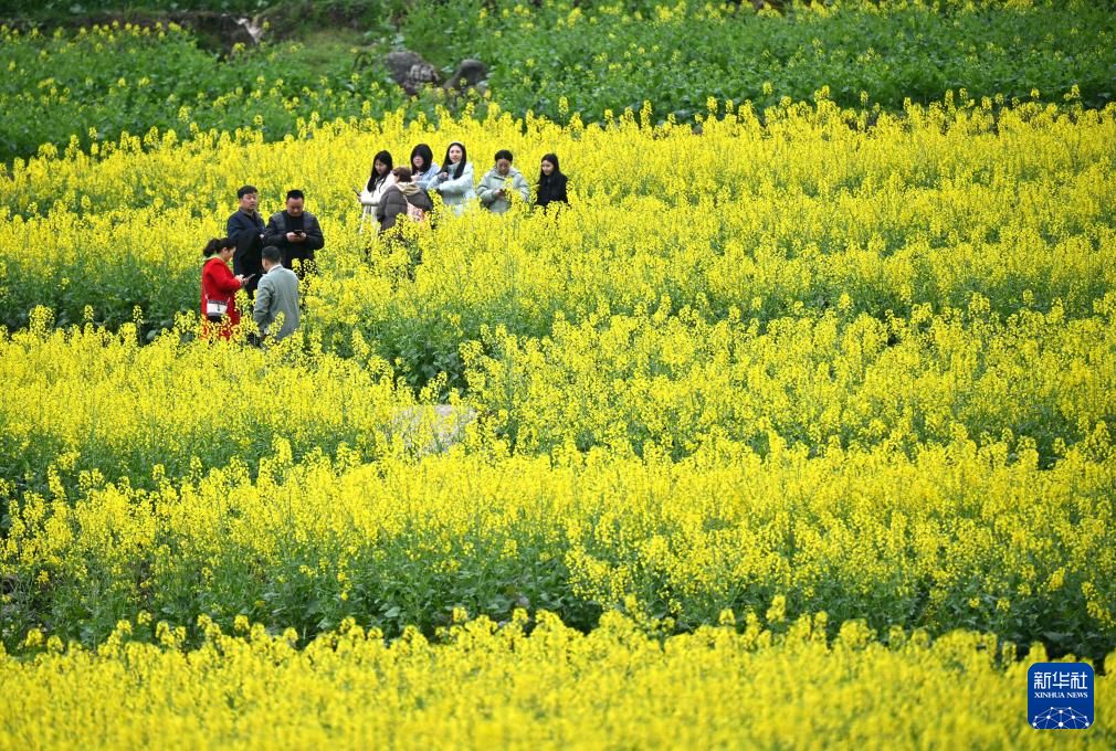 3月19日,重庆三板溪公园内多彩油菜花绽放,春色如画醉游人。市民在油菜花海中游玩。中新社