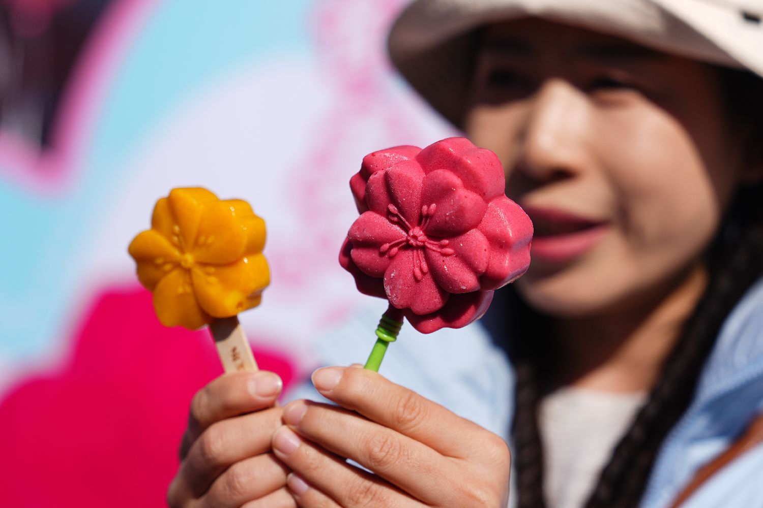 3月19日,工作人员展示北京玉渊潭公园推出的第十代樱花冰淇淋,该冰激凌首次采用亲子款花形。中新社