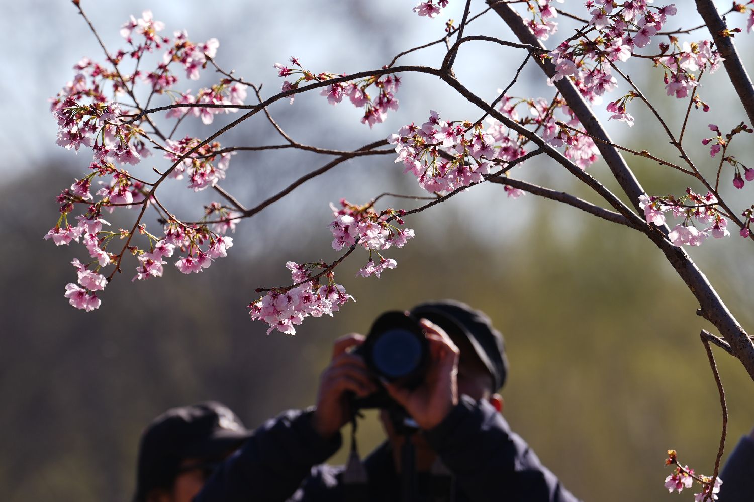 3月19日,北京玉渊潭公园内绽放的樱花吸引民众拍照。中新社