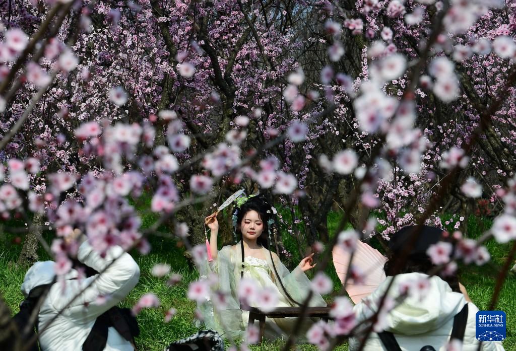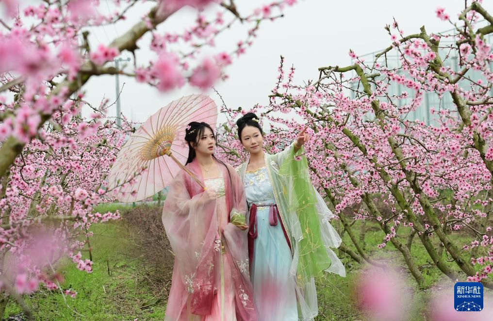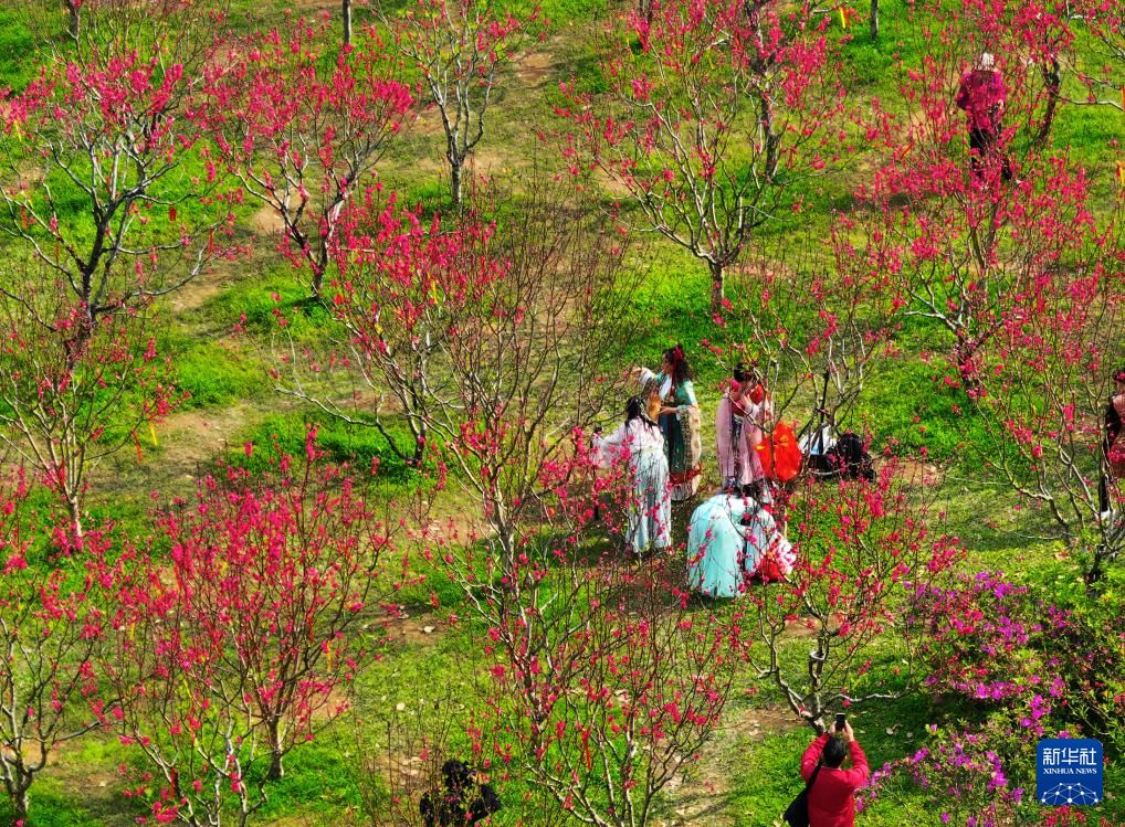 3月18日,游人身着汉服在四川省绵竹市富新镇文永村桃树下拍照。新华社